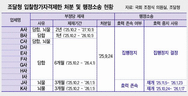 18일 〈대한경제〉가 국회를 통해 확보한 자료를 분석한 결과, 조달청이 지난 9월24일 입찰 담합ㆍ뇌물 공여 등으로 입찰참가자격 제한을 처분한 11개사 중 9개사가 ‘집행정지’ 상태인 것으로 나타났다. 서울행정법원이 지난달 담합 또는 담합ㆍ뇌물 사유로 제재된 업체들의 집행정지 가처분 신청을 받아들인 데 따른 것이다.