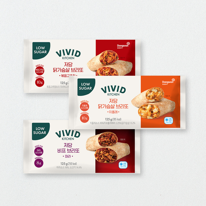 동원홈푸드는 비비드키친 저당 브리또 3종을 새로 출시했다. 비비드키친은 저당ㆍ저칼로리 전문 브랜드로, 지난해 선보인 기존 브리또 3종은 출시 1년 만에 월 판매량이 6배 증가하며 후속 제품 요청이 이어졌다. 신제품은 닭가슴살 치폴레ㆍ볶음고추장ㆍ비프 마라 3종이다. 모두 알룰로스를 활용한 저당 소스로 100g당 당류 5g 미만 기준을 충족한다. 통밀 토르티야와 컬리플라워 라이스를 사용해 식이섬유·포만감을 높였으며 단백질은 8g 이상 함유했다. 23일까지 네이버 스마트스토어에서 브리또 5개 이상 구매 시 35% 할인 행사를 진행한다.