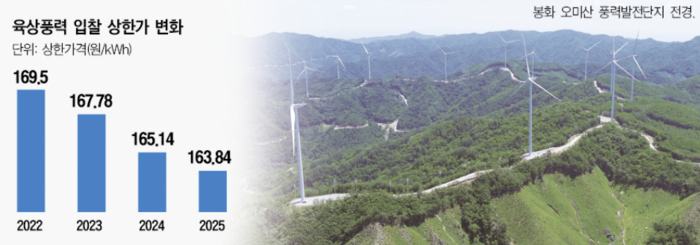 육상풍력 입찰상한가는 지속적으로 낮아지고 있다. 입찰 시행 첫해인 2022년 169.5원이었던 상한가는 2023년 167.78원으로 떨어졌고, 올해는 163원대로 내려 앉았다. 해상풍력 입찰상한가가 2023년 167.8원에서 지난해 176.57원으로 상승한 것과는 대조적이다.