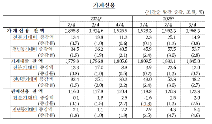 18일 한국은행이 발표한 ‘2025년 3/4분기 가계신용(잠정)’에 따르면 3분기 말 가계신용 잔액은 1968조3000억원으로 전분기 말보다 14조9000억원 증가한 것으로 집계됐다. 이는 2002년 관련 통계 작성 이후 가장 많은 규모다. 다만 증가 폭은 역대 최대였던 2분기(+25조1000억원)에 비해 약 40% 줄었다.