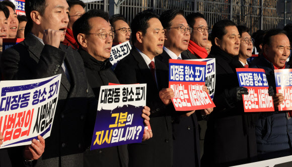 국민의힘은 이날 오전 경기 과천시 법무부 청사 앞에서 ‘대장동 사건 항소 포기 규탄 집회’를 열고, 정성호 법무부 장관과 이진수 법무부 차관의 사퇴를 촉구했다. 국민의힘은 전날에도 대통령실 앞에서 국정조사 촉구 기자회견을 연 바 있다. 국민의힘은 검찰의 항소 포기 결정 이후 대검ㆍ법무부 항의 방문, 국회 본관 앞 규탄대회, 성남 대장동 현장 간담회 등을 연달아 진행하고 있다.