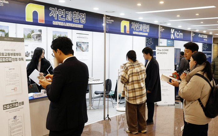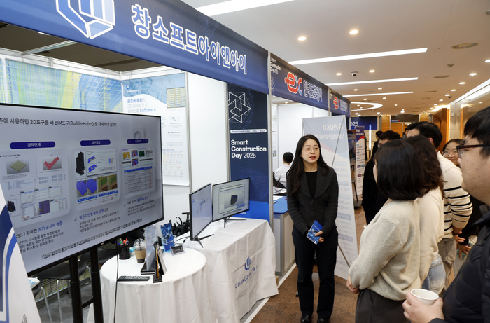 ‘스마트건설의 날 2025’행사에서 참관객들이 건설기술 업체들이 참여한 ‘콘테크 페어’ 전시부스를 살펴보고 있다.