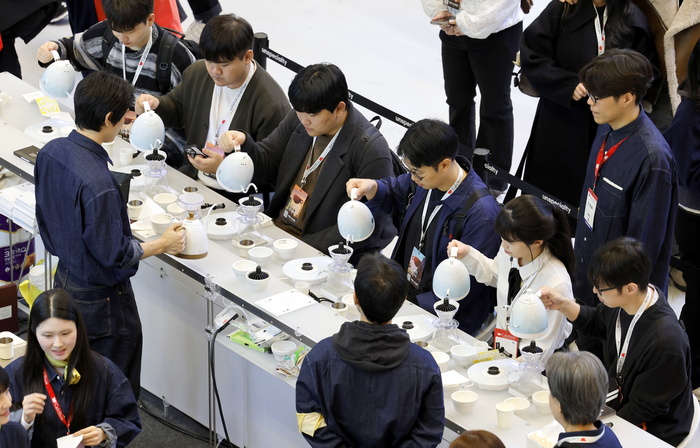 19일 서울 강남구 코엑스에서 열린 ‘2025 서울카페쇼’에서 참관객들이 드립커피 체험을 하고 있다.