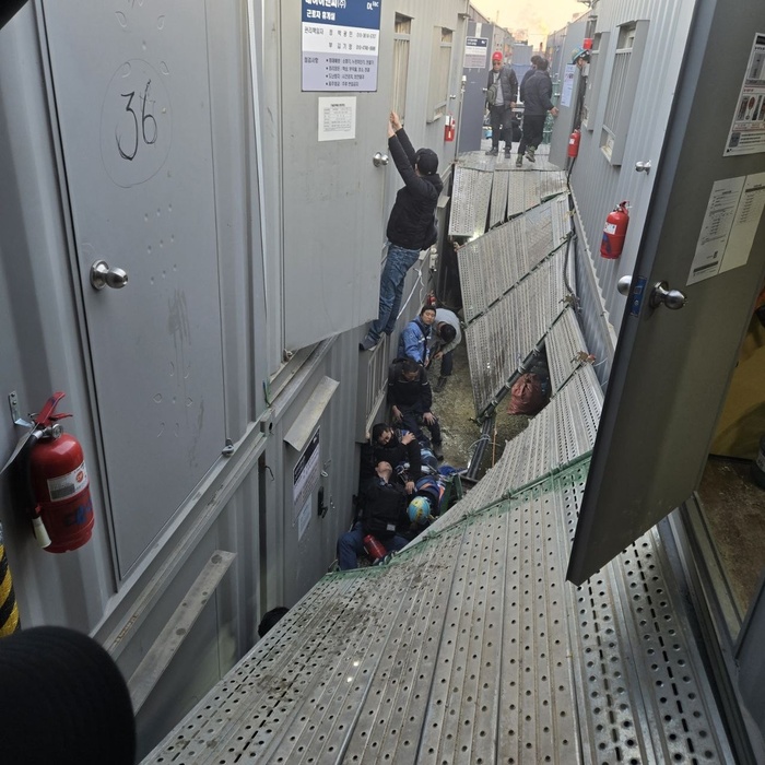 사고 당시 근로자 수십여명이 퇴근 절차를 밟기 위해 발판 위에서 대기 중이었던 것으로 알려졌다. 경찰과 소방당국은 정확한 사고 원인을 조사하고 있다.