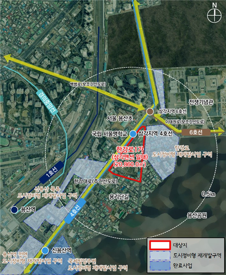 한강로1가 도시정비형 재개발구역은 지하철 4, 6호선 삼각지역 역세권 내에 있다. 삼각맨션이 포함된 구역이다. 삼각맨션 아파트는 준공 50년이 넘은 건축물로 정밀안전진단에서 D등급 판정을 받았다.