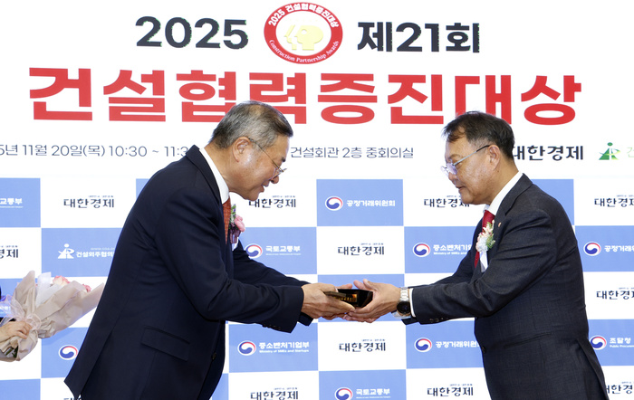 20일 서울시 강남구 논현동 건설회관에서 열린 ‘2025 건설협력증진대상’시상식에서 수상자들과 참석자들이 기념촬영을 하고 있다.