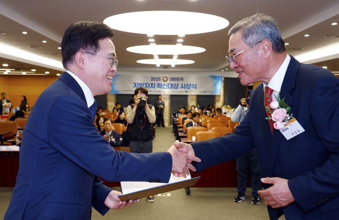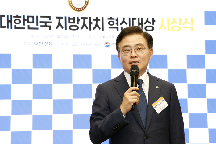 20일 서울 강남구 논현동 건설회관에서 열린 ‘2025 대한민국 지방자치 혁신대상’시상식에서 종합대상을 수상한 강서구 진교훈 구청장이 수상 소감을 말하고 있다. 진교훈 강서구청장이 개인부문에서 최고혁신단체장으로도 선정되면서 강서구는 영예의 2관왕에 올랐다.