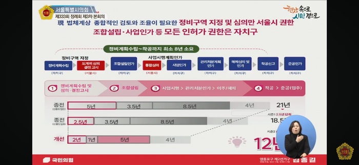 김종길 의원은 “정비사업 시작부터 끝까지 각종 절차는 이미 구청 권한에 속한다”며 “구청이 속도를 낼 수 없는 여러 이유들이 있어서 서울시가 절차를 통폐합한 게 신통기획이다. 이미 통합심의 효과에 대해선 정비사업 관계자들이 더 큰 만족도를 느끼고 있다”고 말했다.