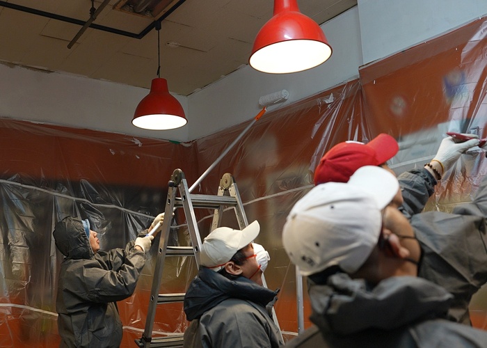 | 서울시 기술교육원 교육생들이 서울 중구 소상공인 노후 점포 환경 개선 작업을 하고 있다. /사진:㈜한화 건설부문 제공 |