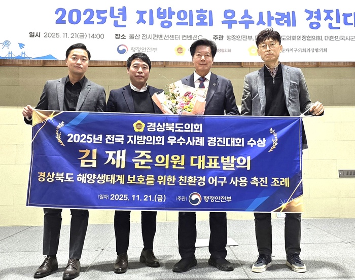 경북도의회 김재준 의원(울진)이 대표 발의한 <경상북도 해양생태계 보호를 위한 친환경 어구 사용 촉진 조례>가 행정안전부 주관 ‘2025년 지방의회 우수사례 경진대회’에서 본선에 진출하며 우수조례로 선정됐다.