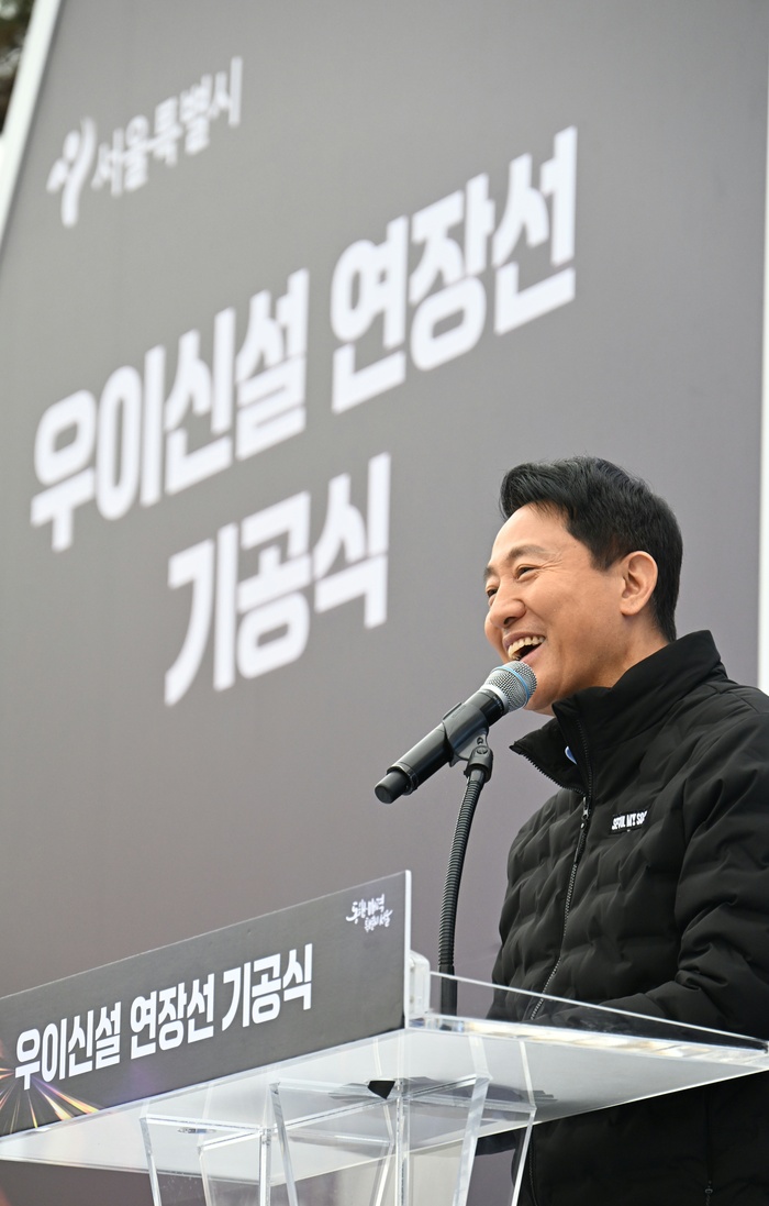 | 오세훈 서울시장이 24일 도봉구 우이신설 연장선 기공식에서 인사말하고 있다. /서울시청 제공 |
