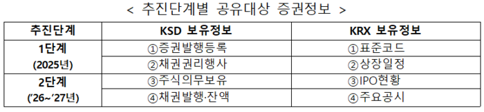 | 예탁원·거래소 '증권의 발행·상장 데이터 공유 시스템 구축' 관련 추진단계별 공유대상 증권정보. / 자료=예탁원 제공 |