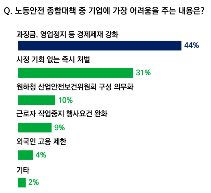 노동안전 종합대책 중 기업에 가장 큰 어려움을 주는 내용이 무엇인지에 대해 44%인 116개사가 ‘과징금, 영업정지 등 경제제재 강화’라고 응답했다.