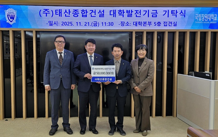 국립창원대학교(총장 박민원)는 대학본부에서 ‘(주)태산종합건설 대학발전기금 기탁식’을 개최했다고 25일 밝혔다.