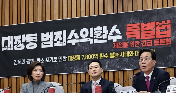 | 송언석 국민의힘 원내대표가 지난 24일 국회에서 열린 대장동 범죄수익환수 특별법 제정을 위한 긴급 토론회에서 발언하고 있다. 왼쪽부터 나경원 의원, 장동혁 대표, 송 원내대표./사진:연합뉴스 |