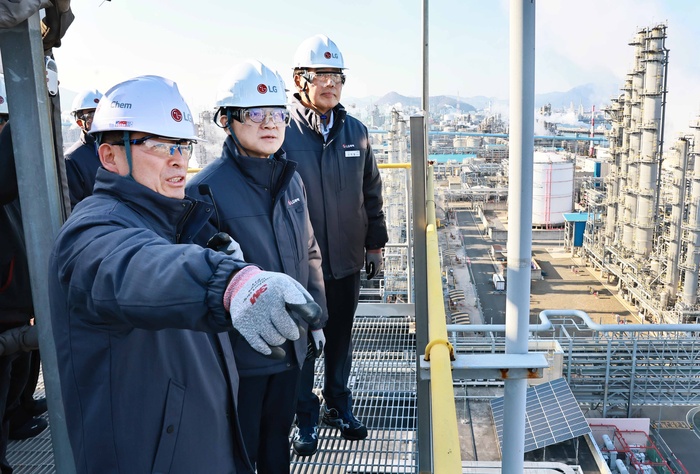 | 김정관 산업부 장관(왼쪽에서 두번째)이 26일 오전 여수산업단지에 소재한 LG화학 산업현장을 방문해 생산 및 안전관리 현황 등을 종합 점검하고 있다. /사진: 산업부 제공 |