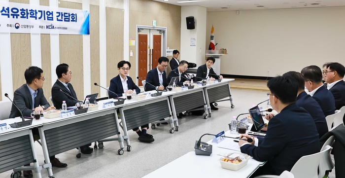 | 김정관 산업부 장관(왼쪽에서 세번째)이 26일 오전 전남 여수시 한국산업단지공단 전남본부 대회의실에서 ‘여수지역 석유화학기업 간담회’를 주재하고 있다. /사진: 산업부 제공 |