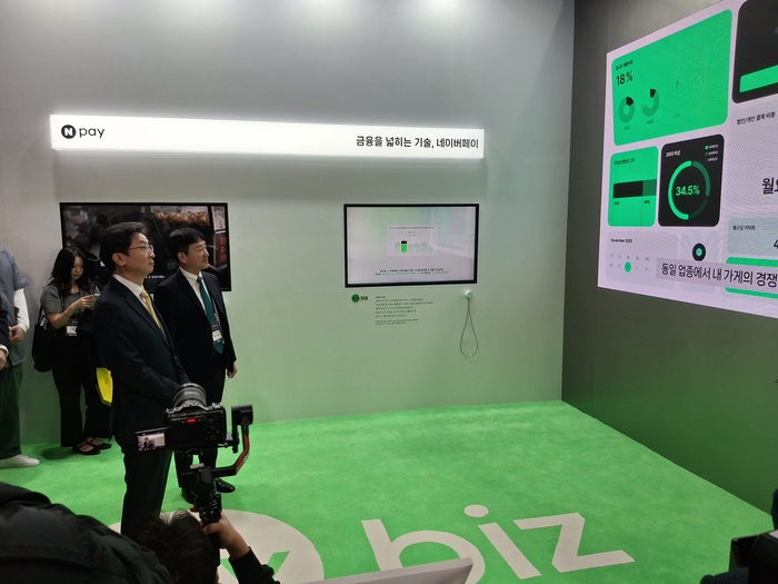 | 26일 서울 서초구 양재 aT센터에서 개최된 ‘코리아 핀테크 위크 2025’의 Npay 부스에서 이억원 금융위원장(왼)이 Npay 박상진 대표(우)와 함께 오프라인 통합 단말기 ‘Npay 커넥트’를 체험하고 있다./사진=김봉정 기자. |
