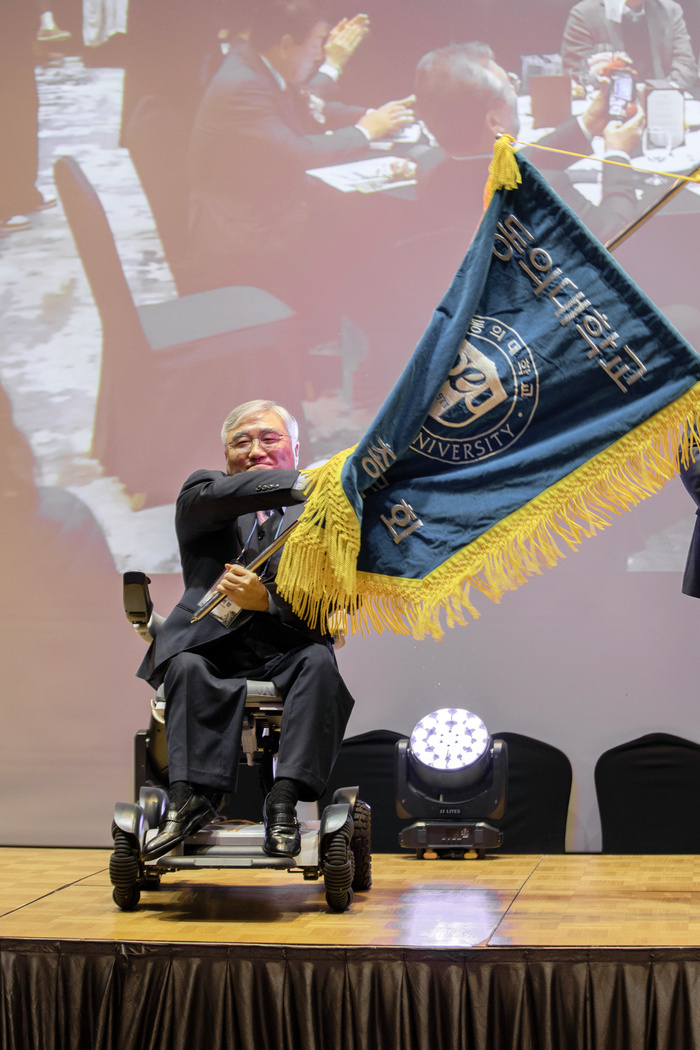 | 동의대 제22대 총동문회장으로 취임한 강병령 회장이 총동창회장기를 흔들고 있다. / 사진 : 동의대학교 제공 |