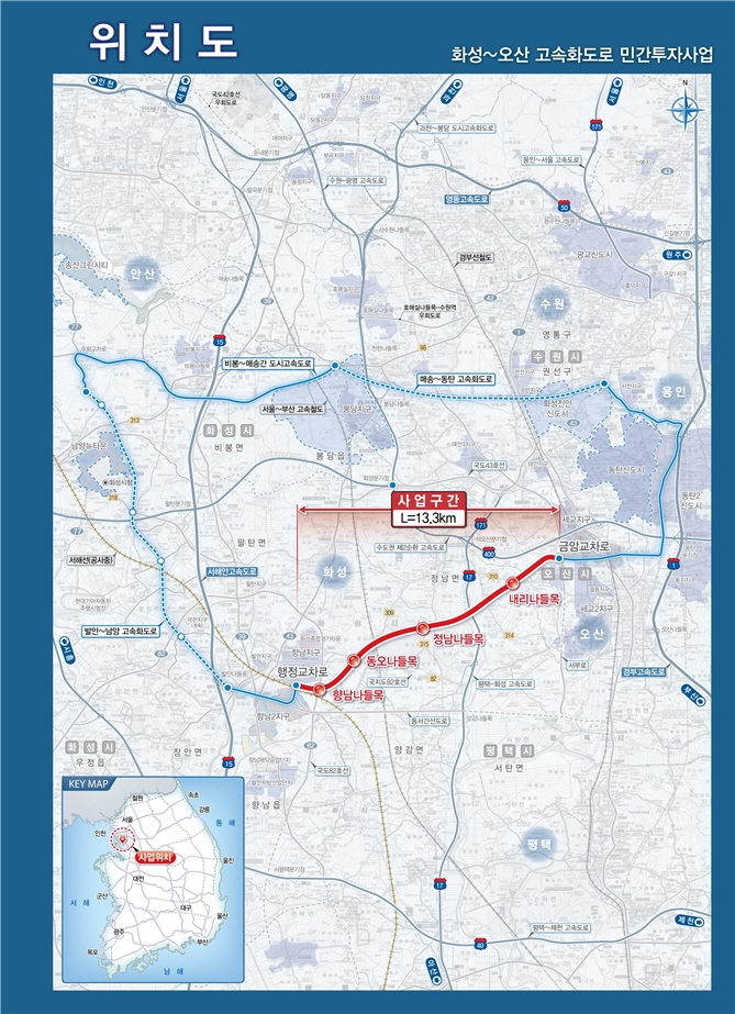 이 사업은 경기도 화성시 향남지구에서 오산시 금암동을 잇는 총 연장 13km의 왕복 4차로 고속화도로를 건설하는 것으로, 총사업비는 6540억원이다. BTO-a(손익공유형 민자사업) 방식이며 민간사업자 운영기간은 50년이다. 오는 2028년 착공해 2032년 개통이 목표다.
