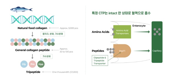 에버콜라겐의 기술적 핵심은 지표 성분인 '트리펩타이드(GPH)'를 다루는 뉴트리만의 노하우에 있다. GPH는 피부 세포와 동일한 분자 구조인 콜라겐 지표 성분으로 뉴트리는 독자적 효소 분해 기술을 적용하여 GPH의 체내 흡수율을 획기적으로 끌어올렸다. 실제로 최근 일반 콜라겐과 뉴트리 독자원료 저분자콜라겐펩타이드 간의 흡수율을 비교한 연구 결과, 저분자콜라겐펩타이드가 체내 흡수율이 무려 54배나 높은 것으로 확인됐다.