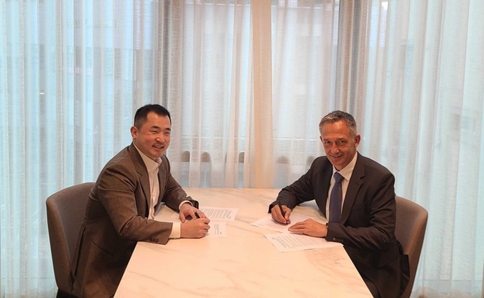 | 윤태진 글래스돔 유럽법인장(왼쪽)과 토마스 로에쉬 코피니티엑스 대표가 파트너십 체결 후 기념 사진을 찍고 있다. /사진: 글래스돔 제공 |