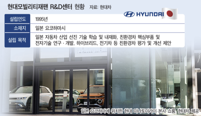 현대차는 일본 요코하마에 일본 법인 ‘현대 모빌리티 재팬’ 본사와 R&D 센터인 ‘일본기술연구소’를 운영하고 있다. 보쉬·ZF 등 글로벌 자동차 기업들이 밀집한 최적의 입지다.
