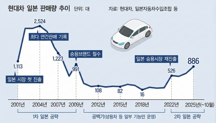 이후 판매량은 내리막길을 걸었고, 2008년 501대까지 추락했다. 도요타·스즈키·혼다 등 쟁쟁한 브랜드가 안방을 지킨 시장은 호락호락하지 않았다. 무엇보다 일본은 수입차 점유율이 4~5%에 불과할 정도로 토종 브랜드를 선호했다. 소형차 수요가 높은 일본에서 쏘나타·그랜저 등 중형 위주 전략을 펼친 것도 실책이었다.