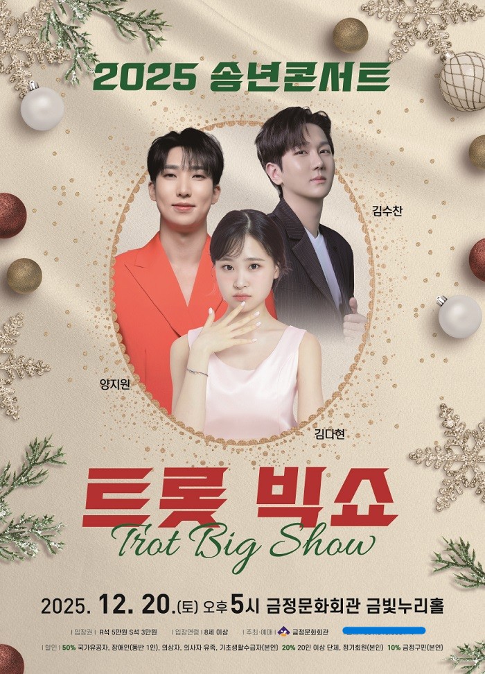 부산시 금정구 (구청장 윤일현)는 오는 2025년 12월 20일, 금정문화회관 금빛누리홀에서 대한민국 트롯계를 이끄는 가수 양지원, 김다현, 김수찬이 한자리에 모인 특별한 송년 콘서트 ‘트롯 빅쇼’를 선보인다고 1일 밝혔다.