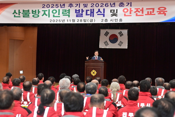 | 진주시는 지난달 28일 시청 2층 시민홀에서 산불감시원 및 산불전문예방진화대, 읍면동 담당 공무원 등 200여 명이 참석한 가운데 ‘2025년 추기 및 2026년 춘기 산불방지 발대식’을 개최했다. / 사진 : 진주시 제공 |