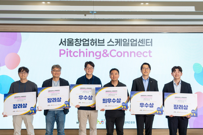 | 지난 6월 서울창업허브 스케일업센터에서 열린 ‘Pitching&Connect’ 행사가 진행된 후의 시상식 사진. 왼쪽부터 베링랩 김재윤 대표, 큐심플러스 노광석 대표, 링크솔루텍 서정목 대표, 휴로틱스 이기욱 대표, 스키아 김현호 CMO. / 사진 : 서울시 제공 |