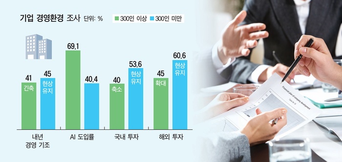 경영 기조는 기업 규모별로 극명히 갈렸다. 300인 이상 기업은 긴축 경영이 41%로 현상 유지나 확대 경영(각 29.5%)보다 높았다. 반면 300인 미만 기업은 현상 유지가 45%로 확대(28.8%)와 긴축(26.1%)을 웃돌았다.