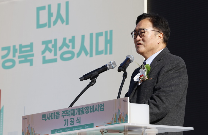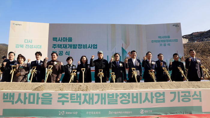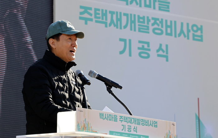 1일 서울 노원구 중계본동 일대에서 열린 백사마을 재개발사업 기공식에서 우원식 국회의장과 오세훈 서울시장 등 참석자들이 시삽하고 있다.