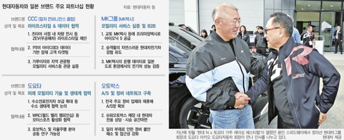 2009년 현대차가 일본 승용차 시장에서 철수하며 교류가 중단됐지만, 2022년 재진출 때 곧바로 관계를 복원했다. MK택시에 아이오닉 5 50대를 공급하는 계약을 맺으면서다. 덕분에 현대차는 일본 소비자가 전기차를 자연스럽게 경험하도록 하고, 택시 운행 데이터를 통해 일본 도로에서 내구성과 품질을 검증하는 기회도 확보했다.