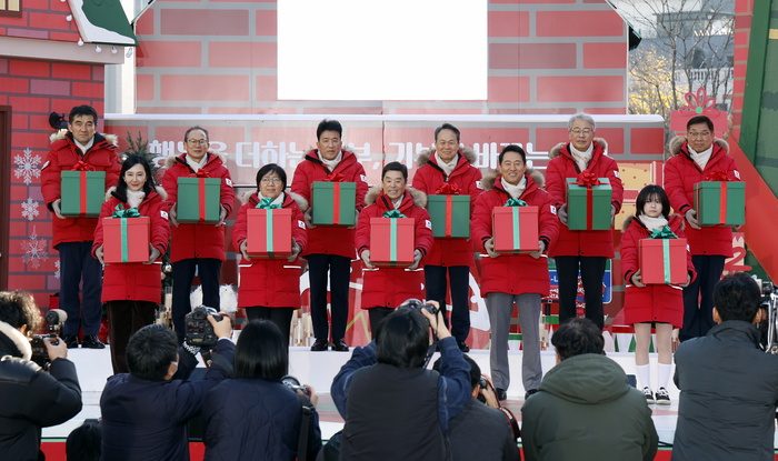 1일 오후 서울 종로구 광화문광장에서 열린 사랑의 열매 ‘희망2026나눔캠페인’ 출범식에서 김병준 사랑의열매 회장을 비롯해 정은경 보건복지부 장관, 오세훈 서울시장, 채시라 배우 등 참석자들이 사랑의 온도탑 점등 퍼포먼스를 하고 있다.