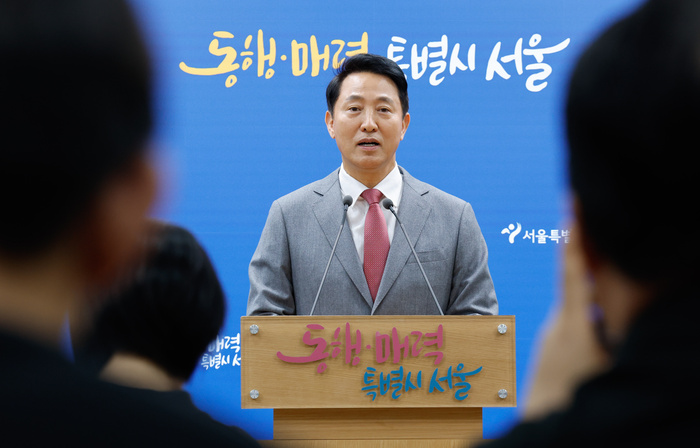 | 오세훈 서울시장이 1일 시청 브리핑룸에서 긴급 브리핑을 열고 민중기 특검팀의 ‘명태균 여론조사 대납 의혹’ 기소에 대한 입장을 밝히고 있다. 안윤수 기자 ays77@ |