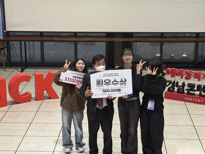 국립창원대학교(총장 박민원)는 메타융합콘텐츠학부(문화테크노학과) 소속 학생 창업팀 ‘3355(삼삼오오)’가 ‘2025 경남CKL 대학생 창업동아리 피칭대회’에서 최우수상(경남문화예술진흥원장상)을 수상했다고 1일 밝혔다.