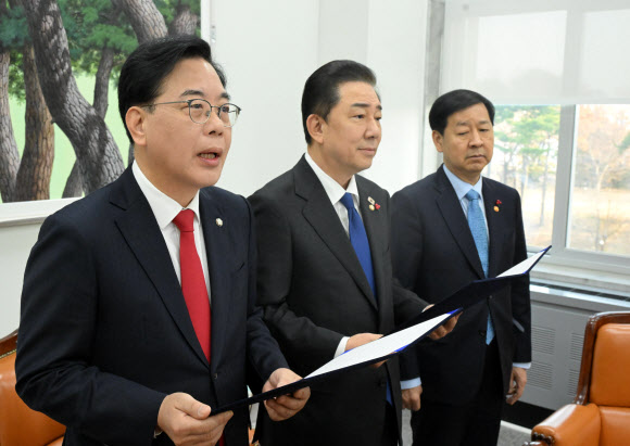 | 더불어민주당 김병기 원내대표(가운데), 국민의힘 송언석 원내대표(왼쪽), 구윤철 부총리 겸 기획재정부 장관이 2일 서울 여의도 국회에서 2026년도 예산안 처리를 위한 합의문을 발표하고 있다./사진:연합뉴스 |