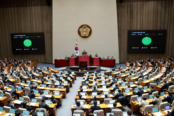 [대한경제=조성아 기자]사상 최대 규모인 728조원의 내년도 예산안이 2일 국회 본회의를 통과했다. 국회가 법정 처리 시한을 지킨 건 2020년 이후 5년 만이다.