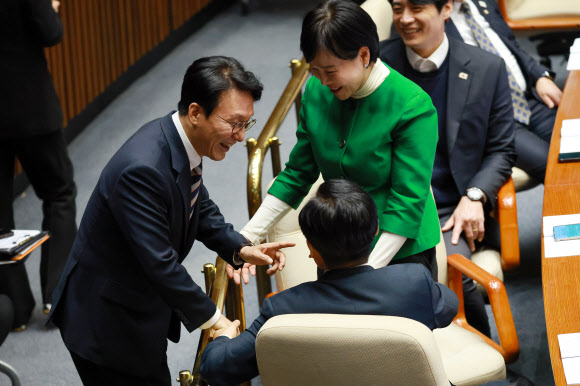 | 김민석 국무총리가 2일 국회 본회의에 참석하며 더불어민주당 정청래 대표, 전현희 의원과 대화하고 있다./사진:연합뉴스 |