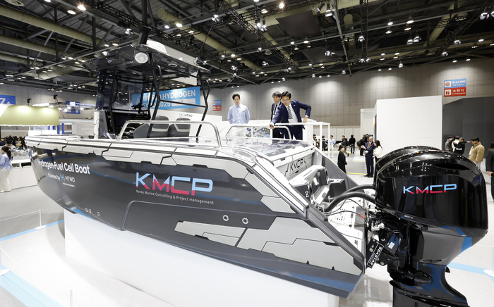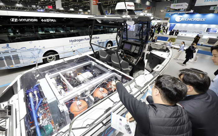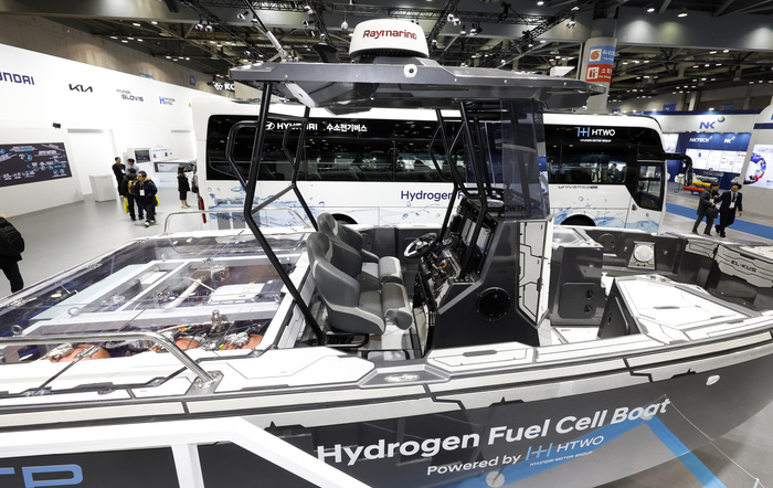 4일 경기도 고양시 킨텍스에서 열린 월드 하이드로젠 엑스포(WHE 2025)에서 관람객들이 현대차가 선보인 수소전기 보트를 살펴보고 있다.