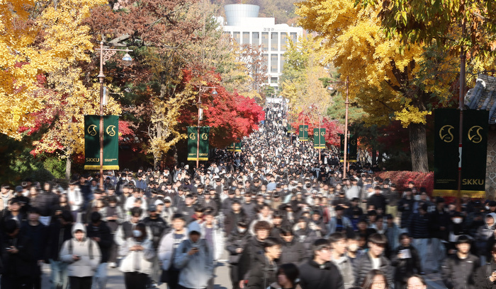 | 수능 후 첫 주말인 지난 16일 오전 서울 종로구 성균관대에서 열린 2026학년도 수시모집 논술시험을 마친 수험생들이 고사장을 나서고 있다. 서강대, 성균관대 등 주말 동안 10여 개 대학이 논술고사를 진행했다. / 사진 : 안윤수 기자 |
