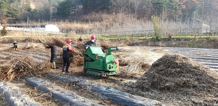 영주국유림관리소는 이를 사전에 차단하기 위해 지난 봄부터 영주·봉화·안동·문경·예천·의성 등 관내 지역의 산림연접지(100m 이내)를 대상으로 파쇄 지원 신청을 받아 지원단을 운영하고 있다. 현재까지 19개 농가에서 발생한 영농부산물 4만6,980㎡를 수거‧파쇄하며 현장의 호응을 얻고 있다.