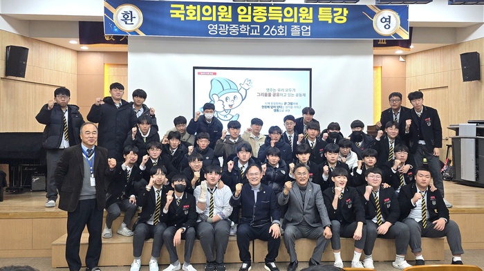 영광중 26회 졸업생인 임 의원은 이날 강연에서 자신의 성장 배경과 국가 안보 현장에서의 경험을 토대로 학생들에게 진로 설계와 태도에 대한 현실적 조언을 전달했다.