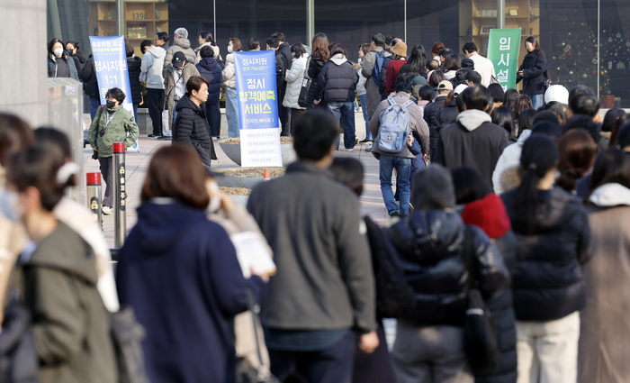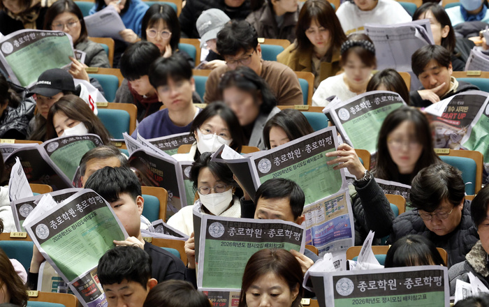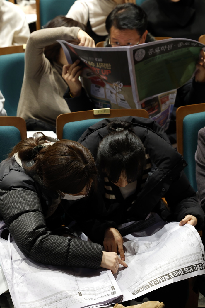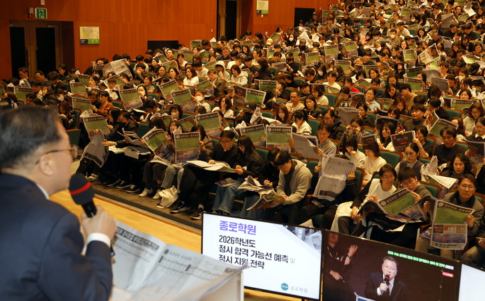 7일 오후 종로학원 주최로 서울 종로구 성균관대학교에서 열린 ‘2026학년도 정시 합격선 및 지원전략 설명회’에서 수험생과 학부모가 정시 배치표를 살펴보며 설명을 듣고 있다.