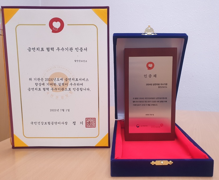 함안군보건소는 국민건강보험공단이 주관한 2025년 금연치료지원사업 평가에서 ‘금연치료 협력 우수기관’에 선정돼 인증서와 인증패를 받았다고 8일 전했다.
