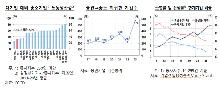 최기산 과장은 "정부 지원이 성장성 중심으로 선별적인 지원이 아닌 매출 기준만 맞추면 지원받는 보편적 지원으로 이어졌다"며 "오히려 성장하면 이같은 지원을 받을 수 없어 중견기업으로의 성장을 지양하는 피터팬 증후군이 나타났다"고 지적했다.
