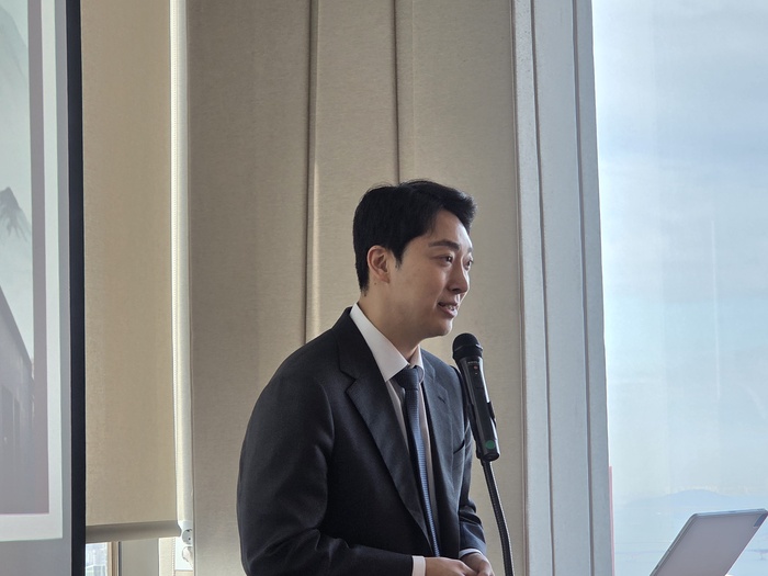 | 9일 서울 여의도 63스퀘어에서 열린 기업공개(IPO) 기자간담회에서 박용준 삼진식품 대표이사가 기업소개 발표를 진행하고 있다./사진=김동섭 기자 |