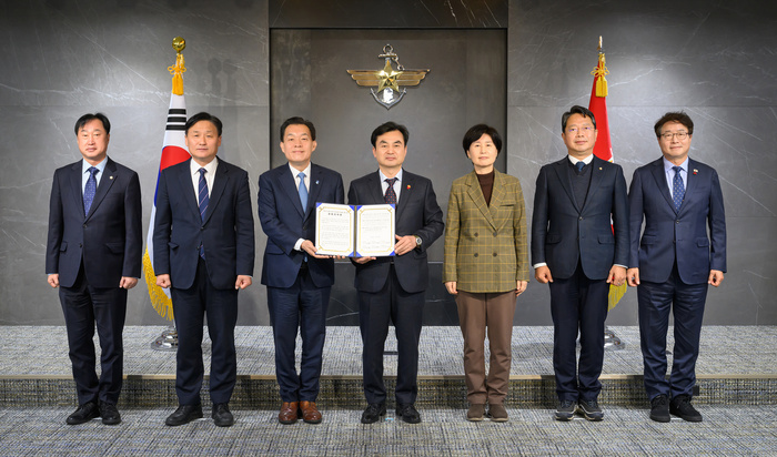 | 이재준 수원시장(왼쪽 세 번째)과 수원 지역 국회의원 5명이 안규백 국방부장관(왼쪽 4번째)에게 ‘수원 군 공항 이전의 국가전략 사업화를 위한 공동 건의문’을 전달한 후 함께하고 있다. 왼쪽부터 김준혁 의원, 김영진 의원, 이재준 시장, 안규백 장관, 백혜련 의원, 김승원 의원, 염태영 의원. / 사진 : 국방부 제공 |