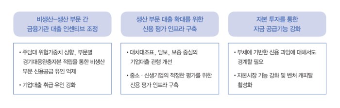 한은은 생산적 금융 확대를 위해 금융기관의 대출 인센티브를 조정하고 중소기업 특화 신용평가 기관 설립 등 평가 인프라 구축이 필요하다는 의견이다.